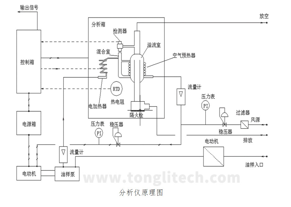 定量进入的油样经油加热器进入闪蒸器和定量的压缩空气混合,油气从闪蒸器进入反应器内,油气和铂催化剂接触,油气在铂催化剂作用下发生热化学反应,随着油气浓度的变化,其反应的热量Q也发生变化。由传感器、油加热器等组成的闭环控制系统自动调节,使传感器测得的油气浓度信号与给定值相等,调节系统便趋于平衡,此时由置入油管内的传感器测得的温度即为被测油样的闪点值。
